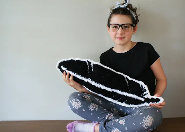 Knit your own black and white 26" long feather pillow. This pattern uses stockinette stitch, with stranded colorwork techniques, to create a fun and modern feather. Knit with #4 worsted weight acrylic yarn, this cushion is durable and easily washable. These instructions are a combination of written and colorwork charts, making it an easy to follow how-to.